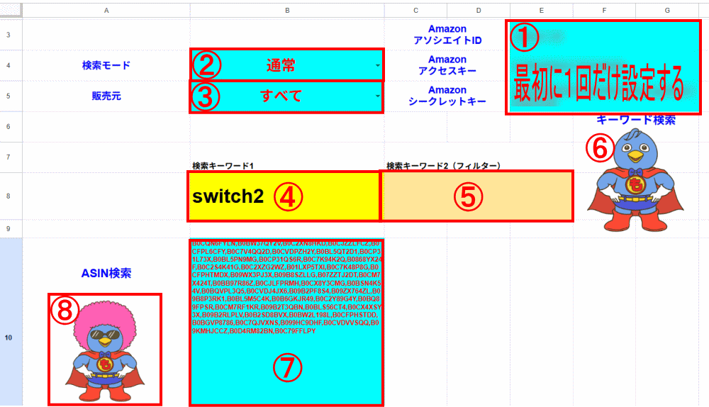 ⑦検索したいASIN(商品に個別に割り当てられる識別番号)を入力します。ASINは、特典の『拡張機能(ASIN抽出ツール)』で取得できます。